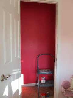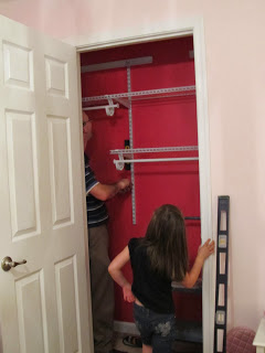 My husband and I worked together on this project and he started by taking out the old wire shelving and patching the holes. I decided I would paint the closet a bright pink to coordinate with my daughter's pink bedroom. It only took a quart of paint, but because of the dark color it did take several coats.